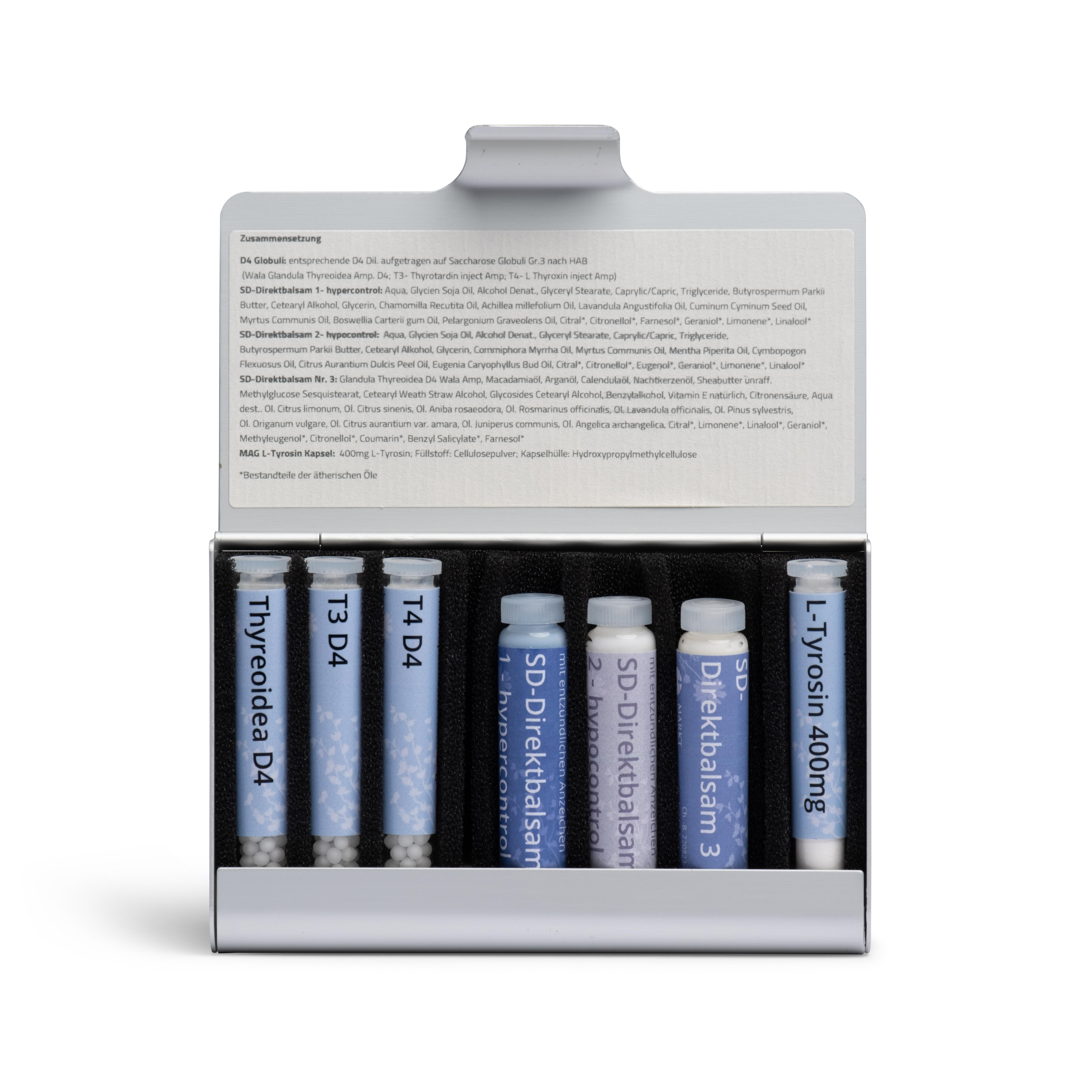 Die Taschenapotheke ist aus robustem Aluminium und enthält zum Schutz der Röhrchen eine Schaumstoffeinlage.